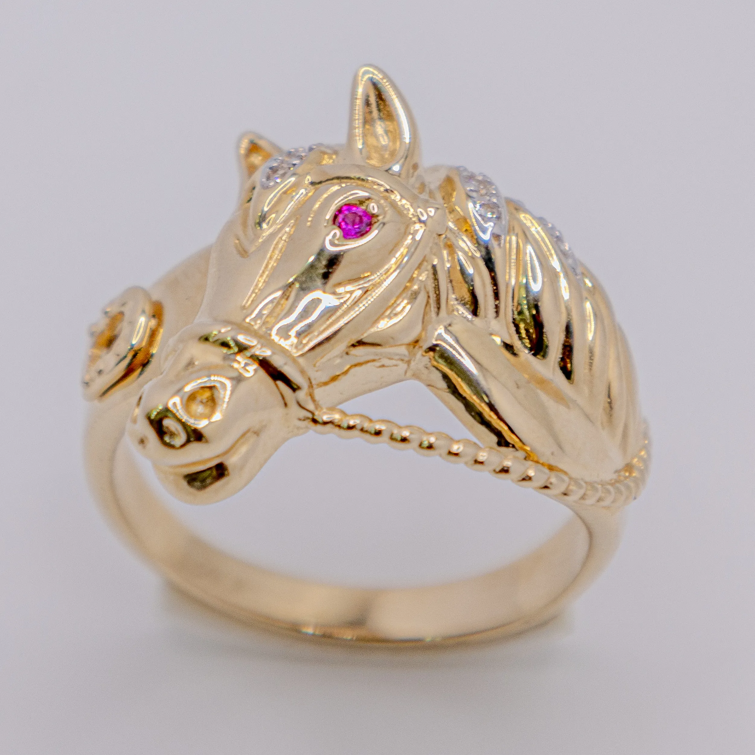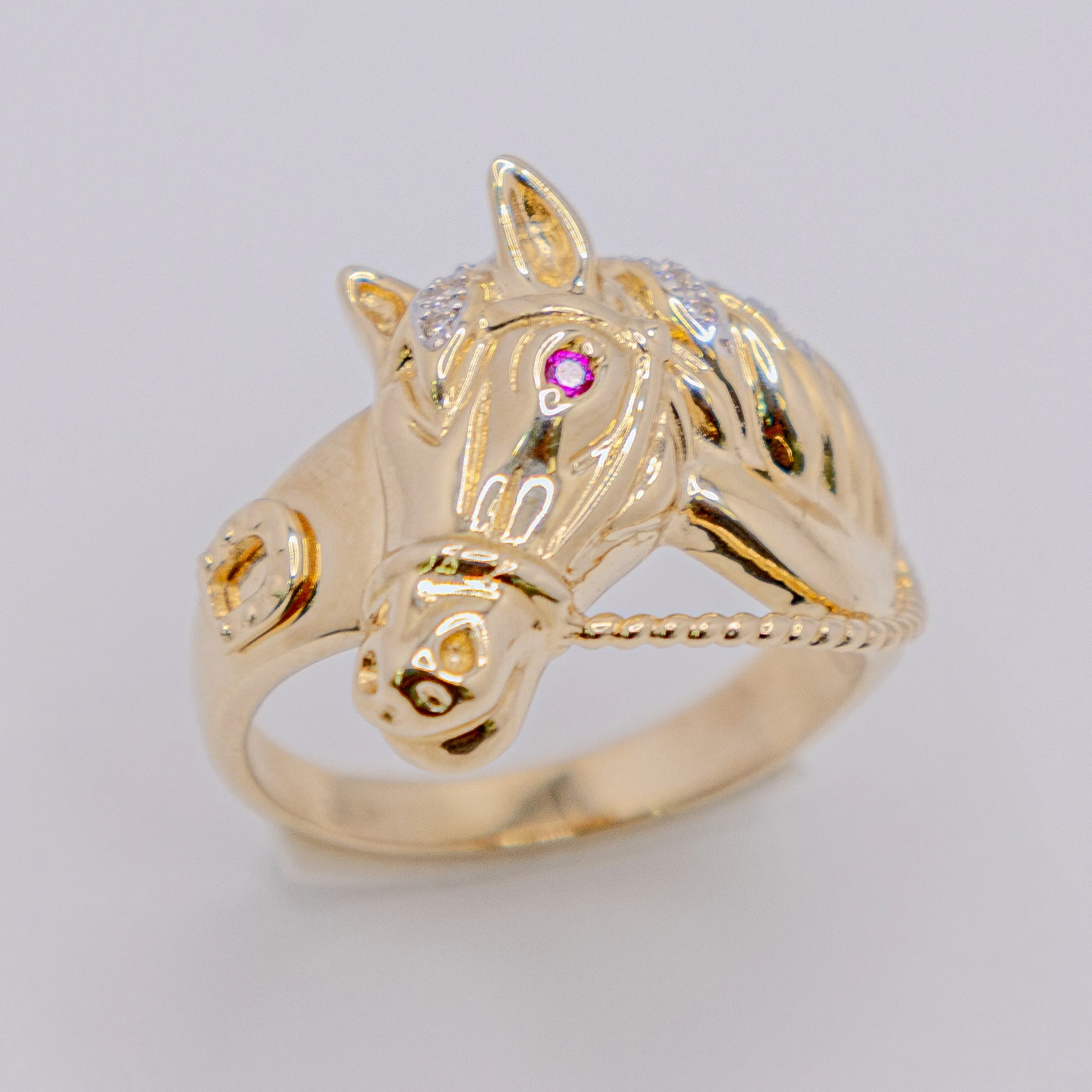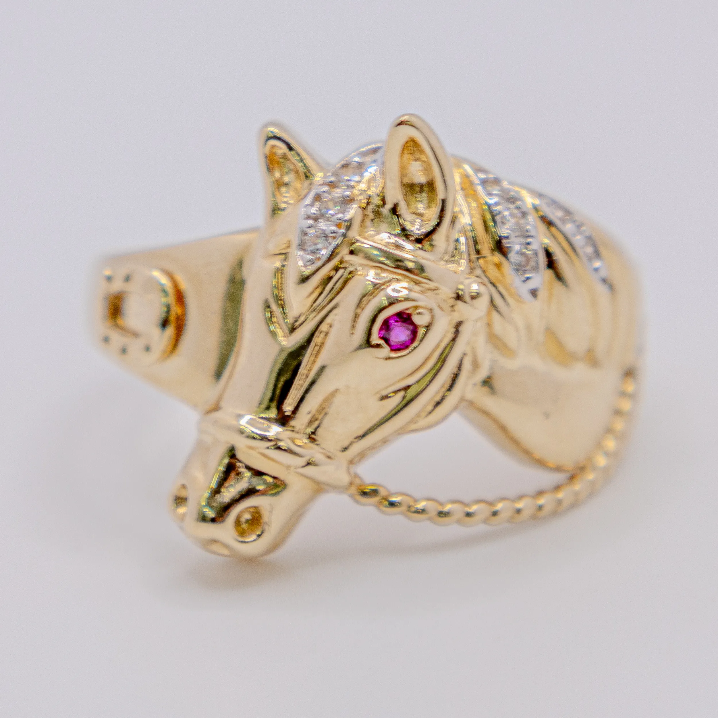 Anillo de Oro 14k con imagen de caballo con piedra color Rubi, Size 11 1/2 y 10,5g.