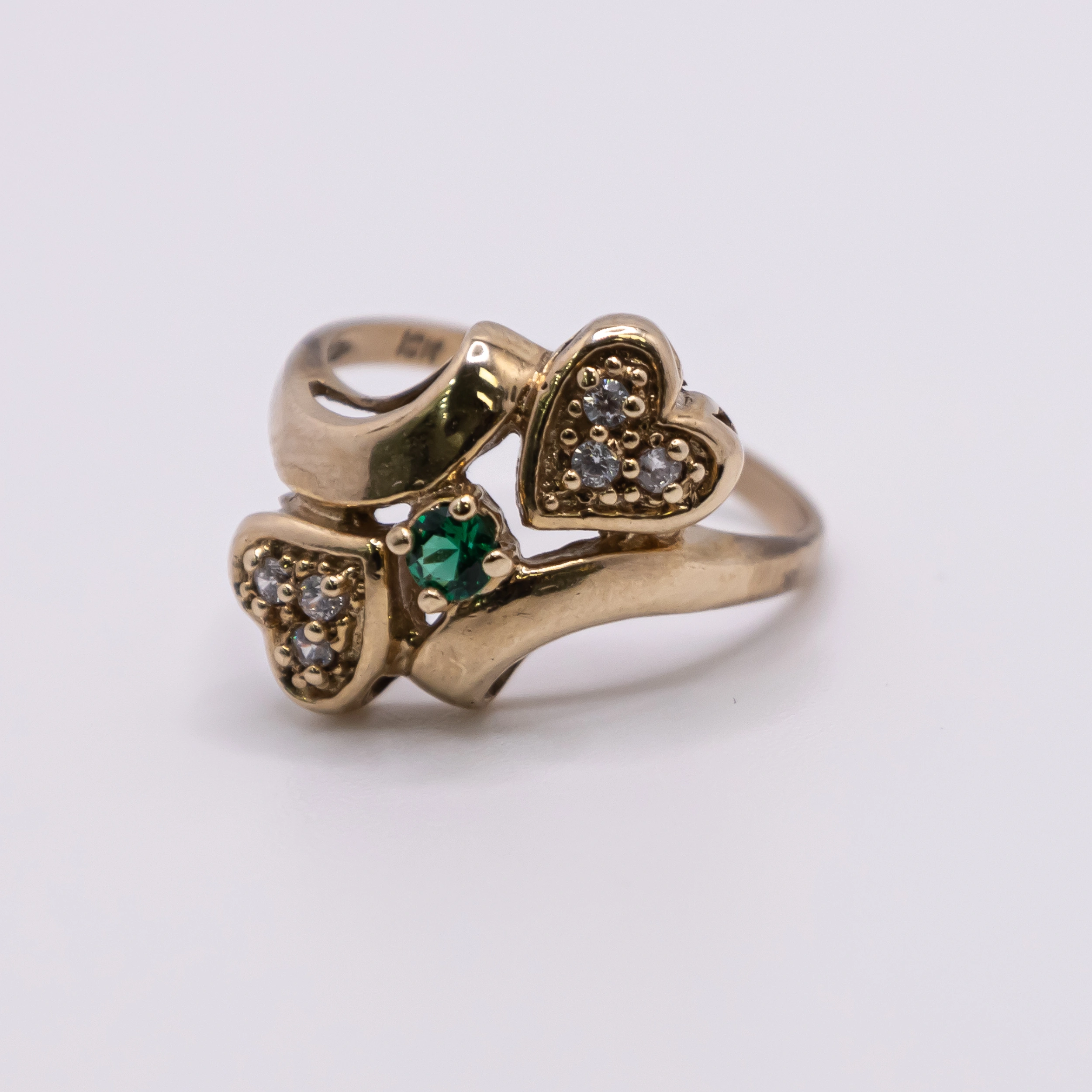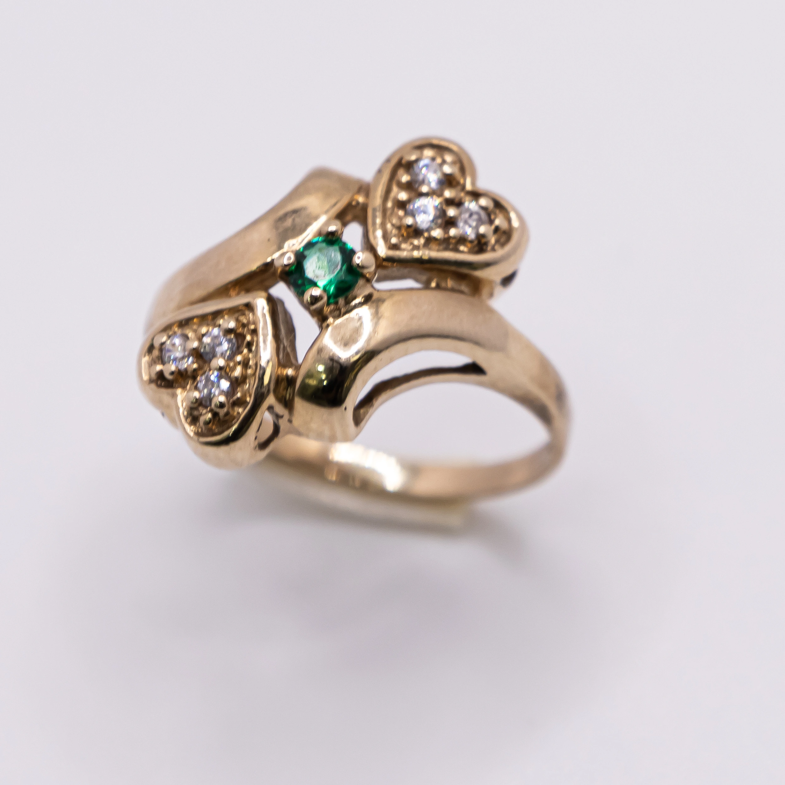 Anillo de Oro 10k para mujer con zirconia y piedra verde color Esmeralda ente corazones, Size 5 1/2