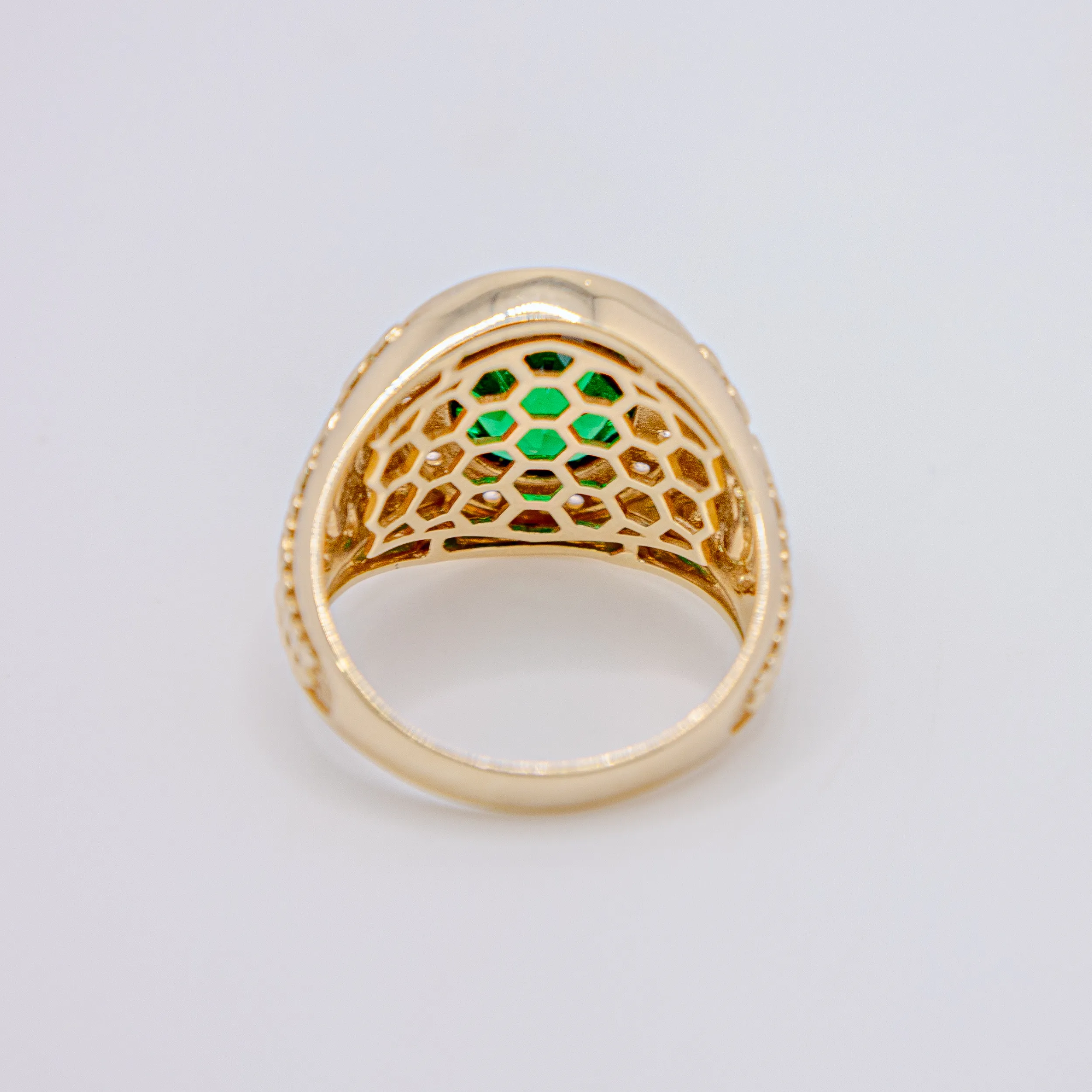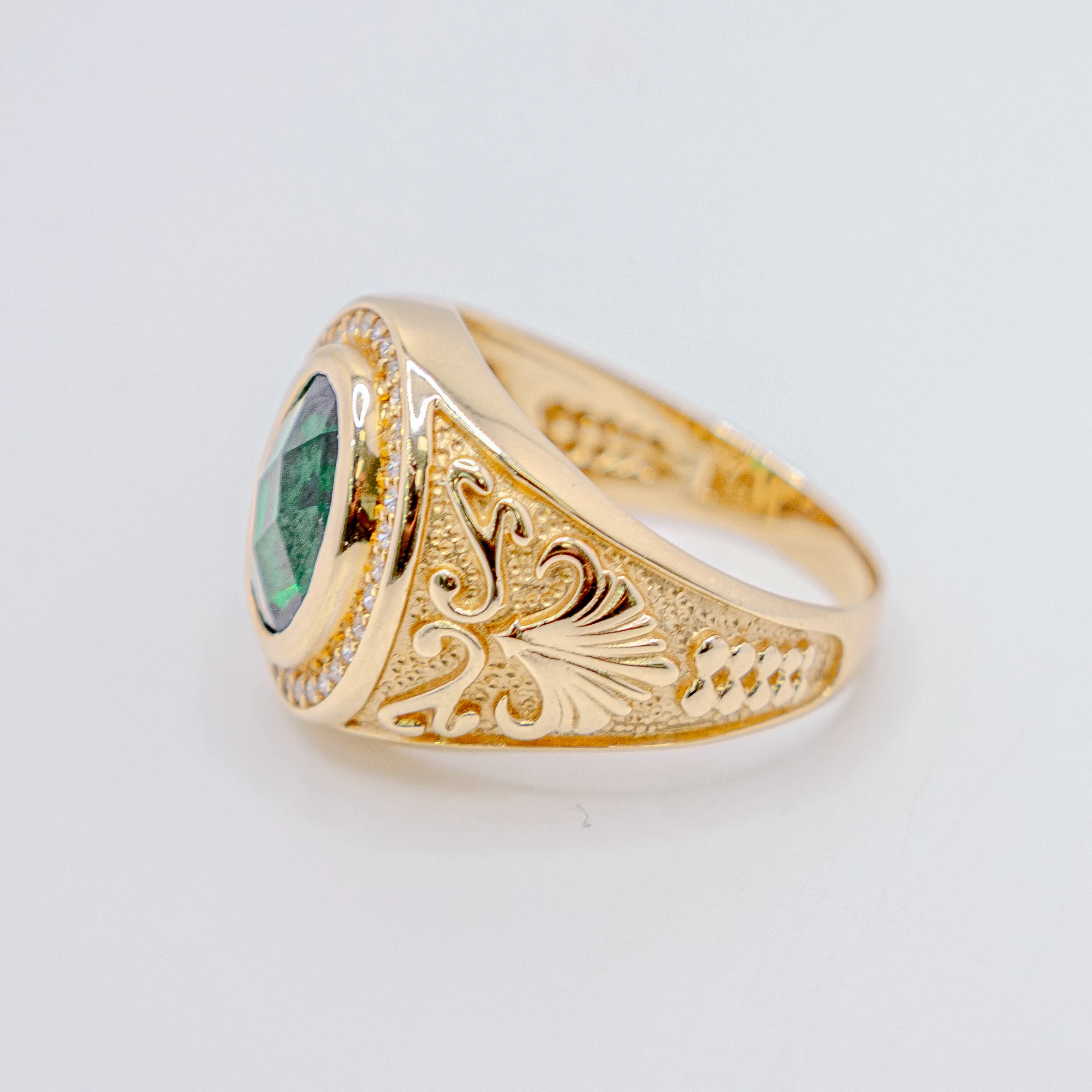 Anillo de oro 14k con zirconia alrededor de una piedra verde ovalada. Size 11 y 10,0g.