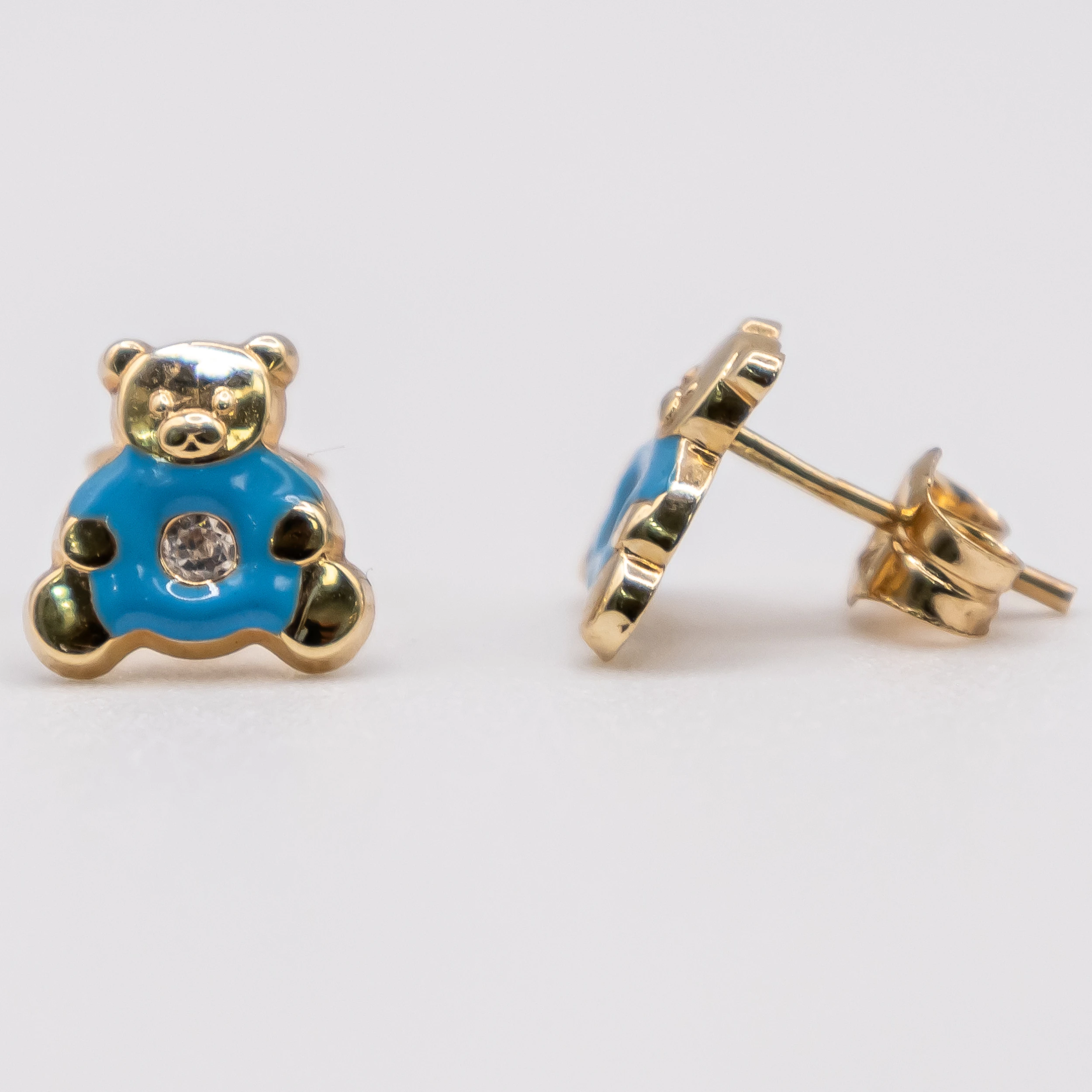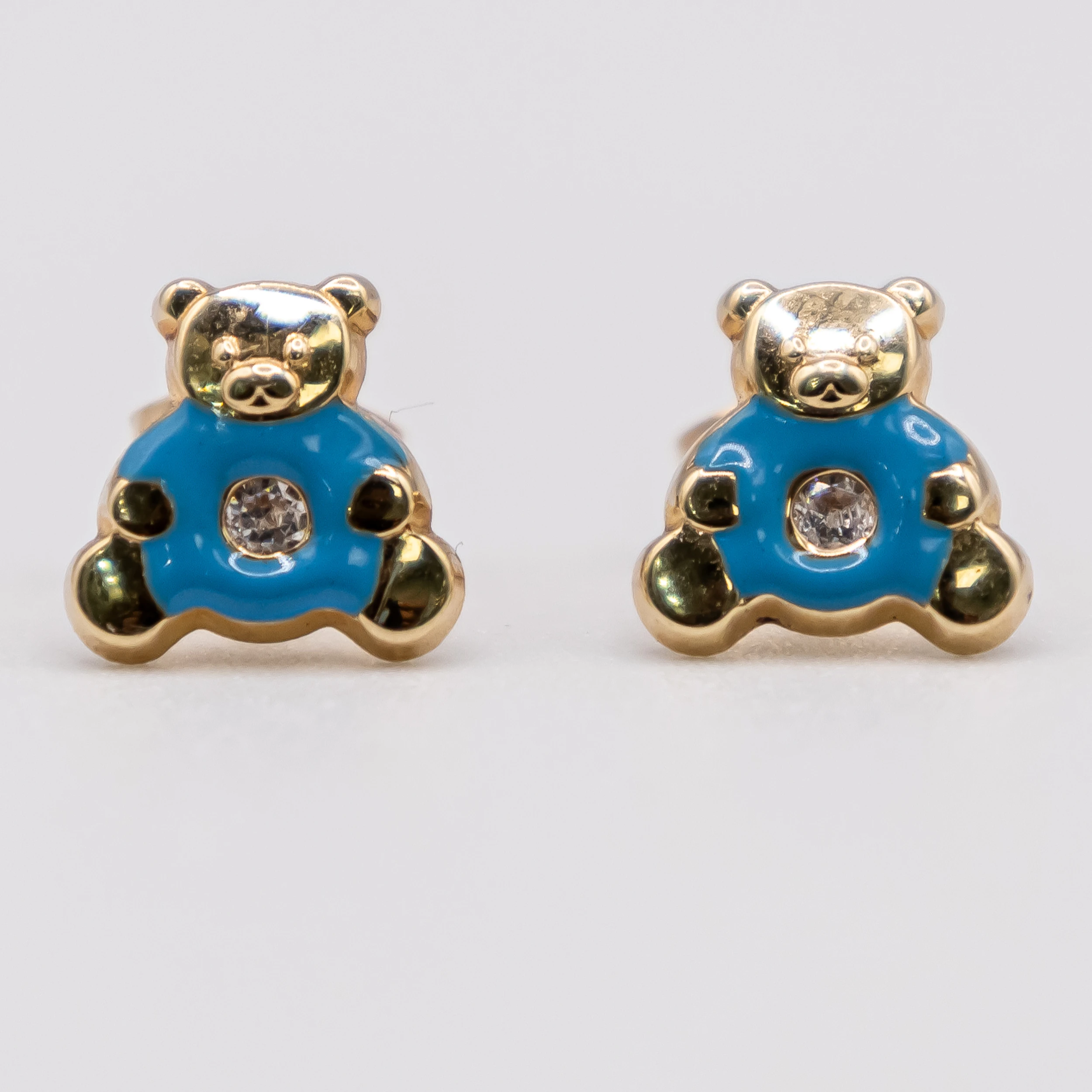 Aretes de oro 14k y zirconia con diseño de osito y dona azul.