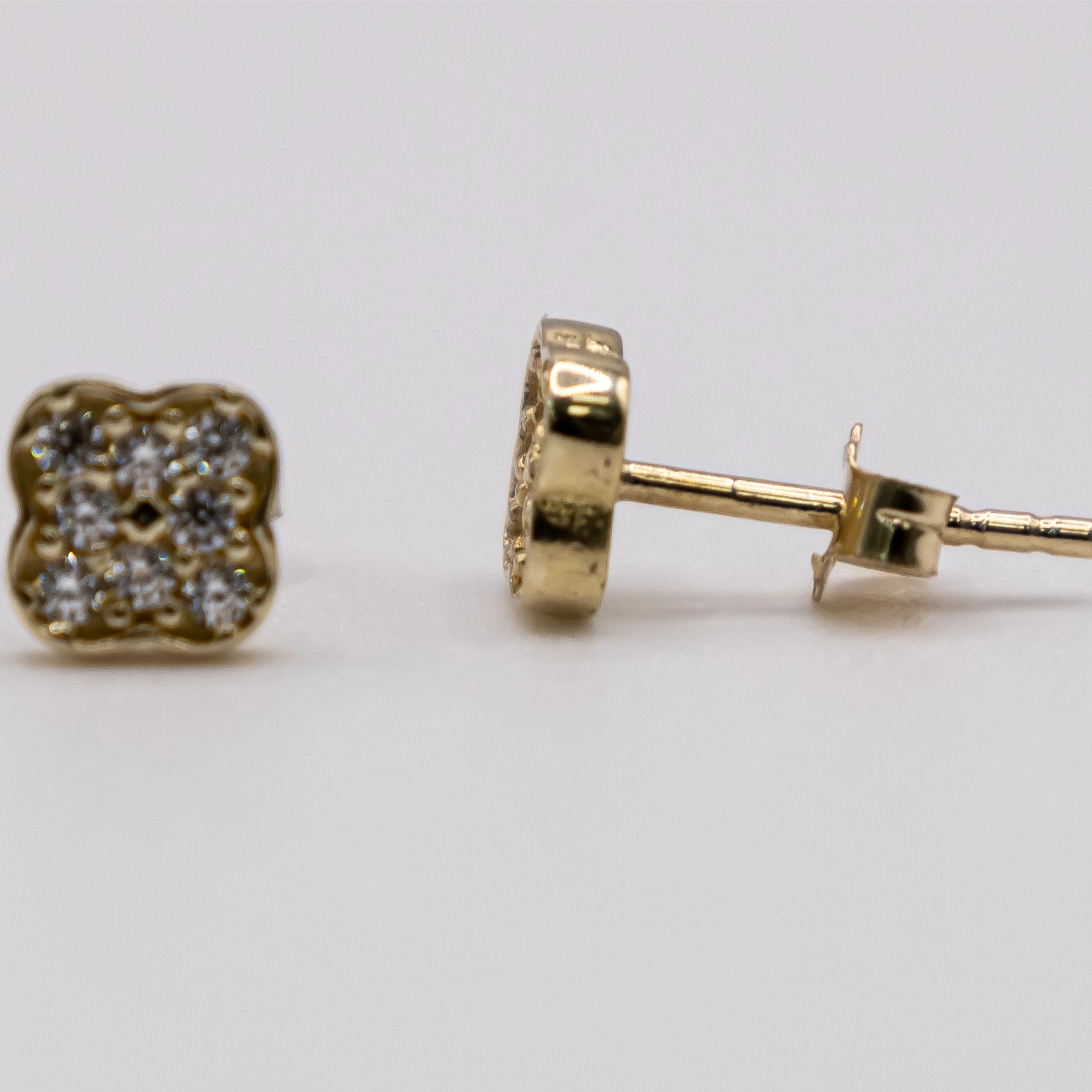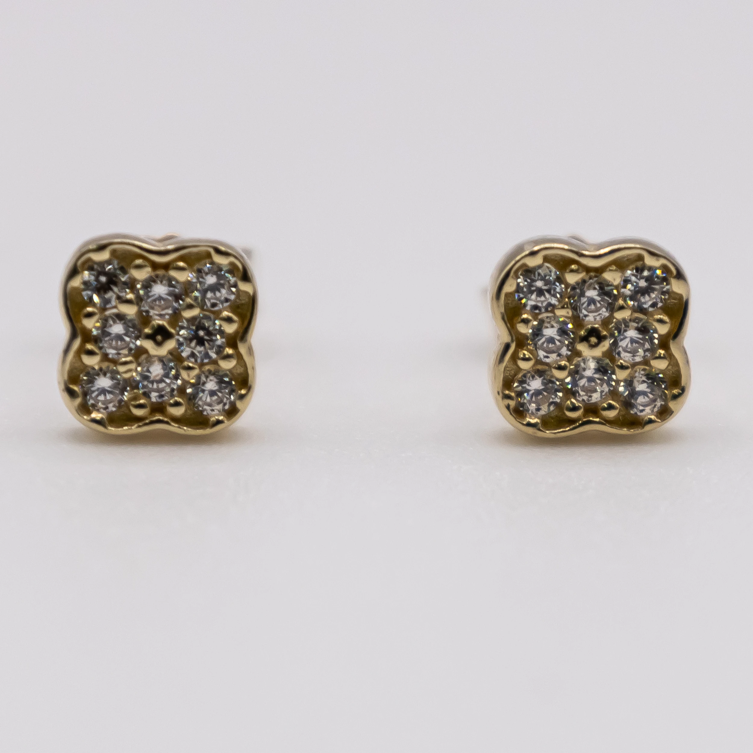 Aretes de oro 10k y zirconia con diseño de trébol.