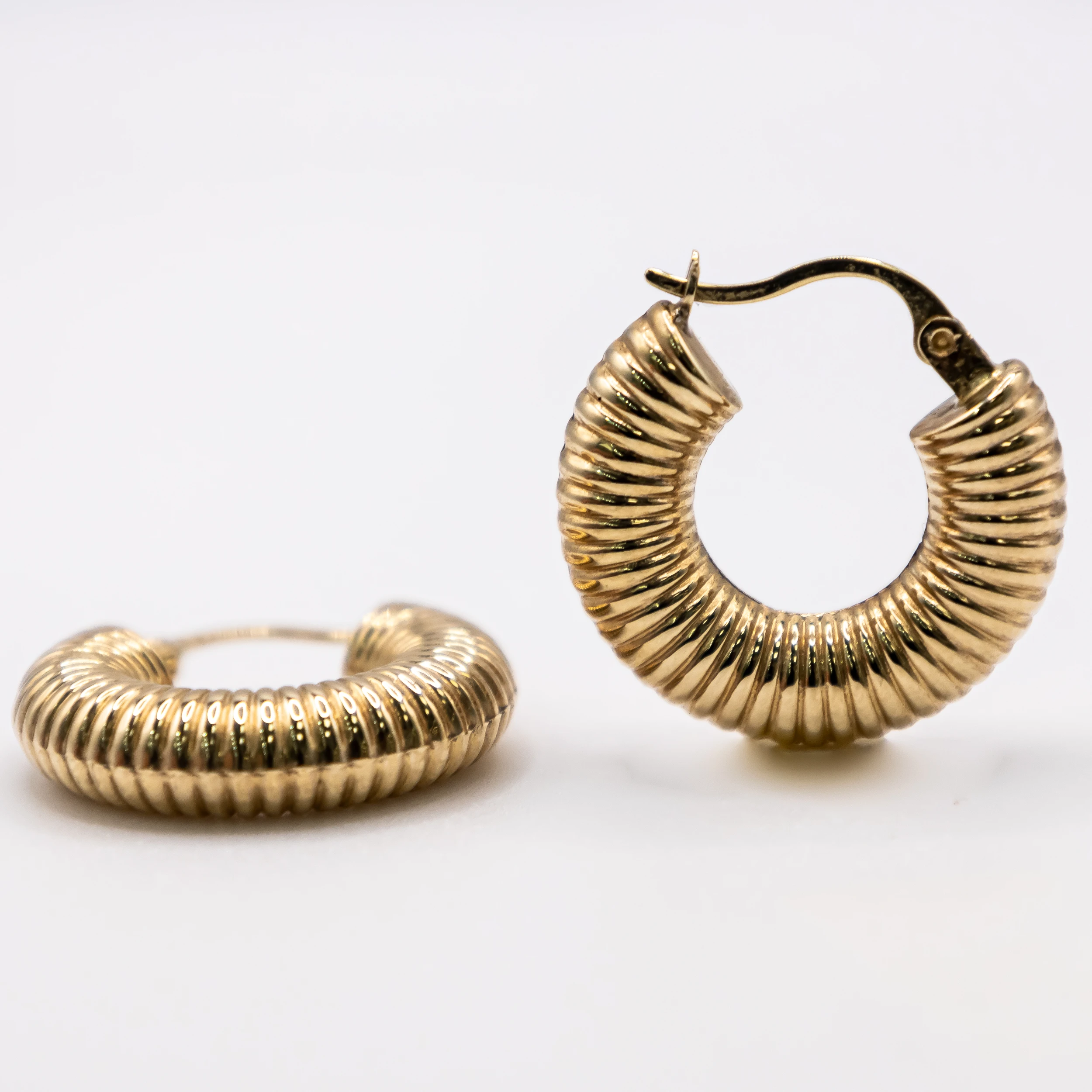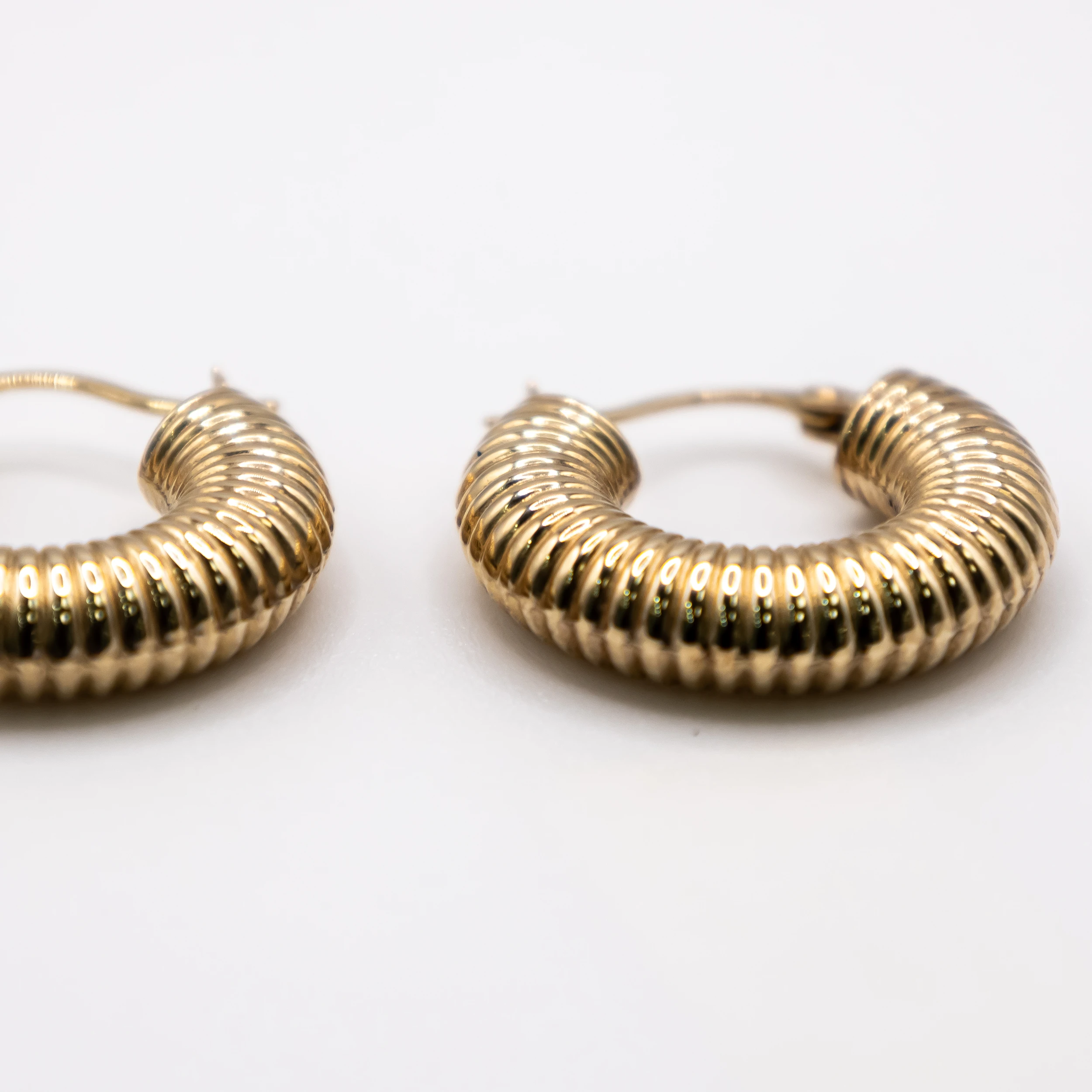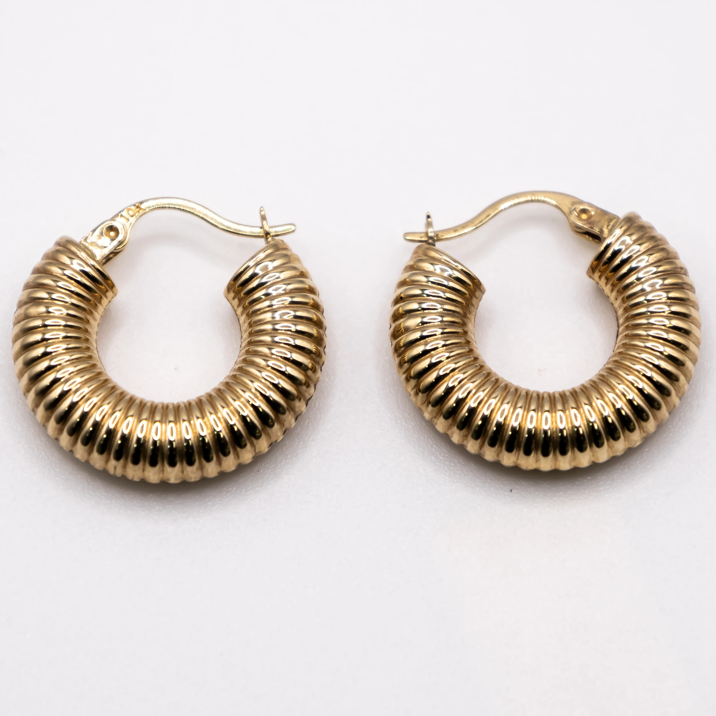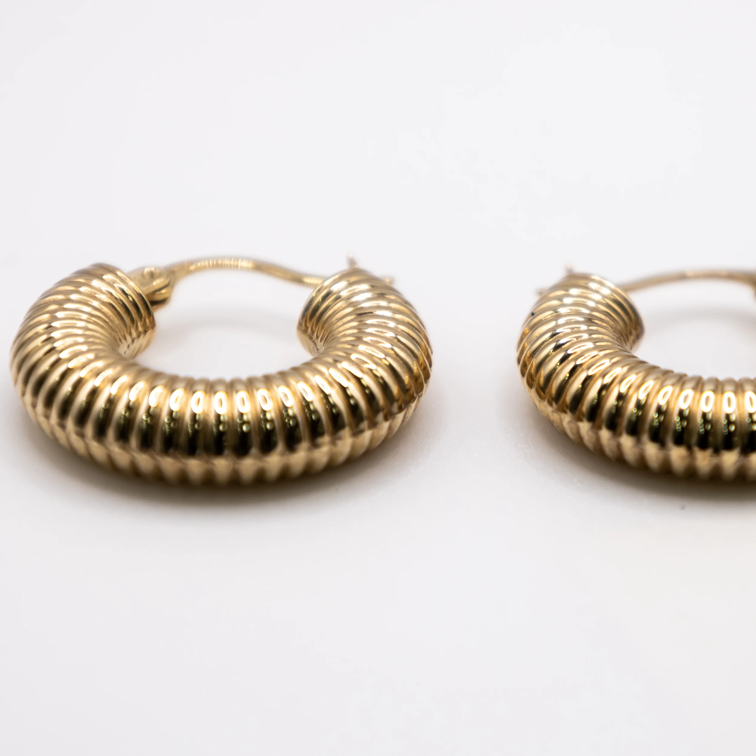 Argollas de oro 10k con diseño trenzado en espiral en aro grueso.