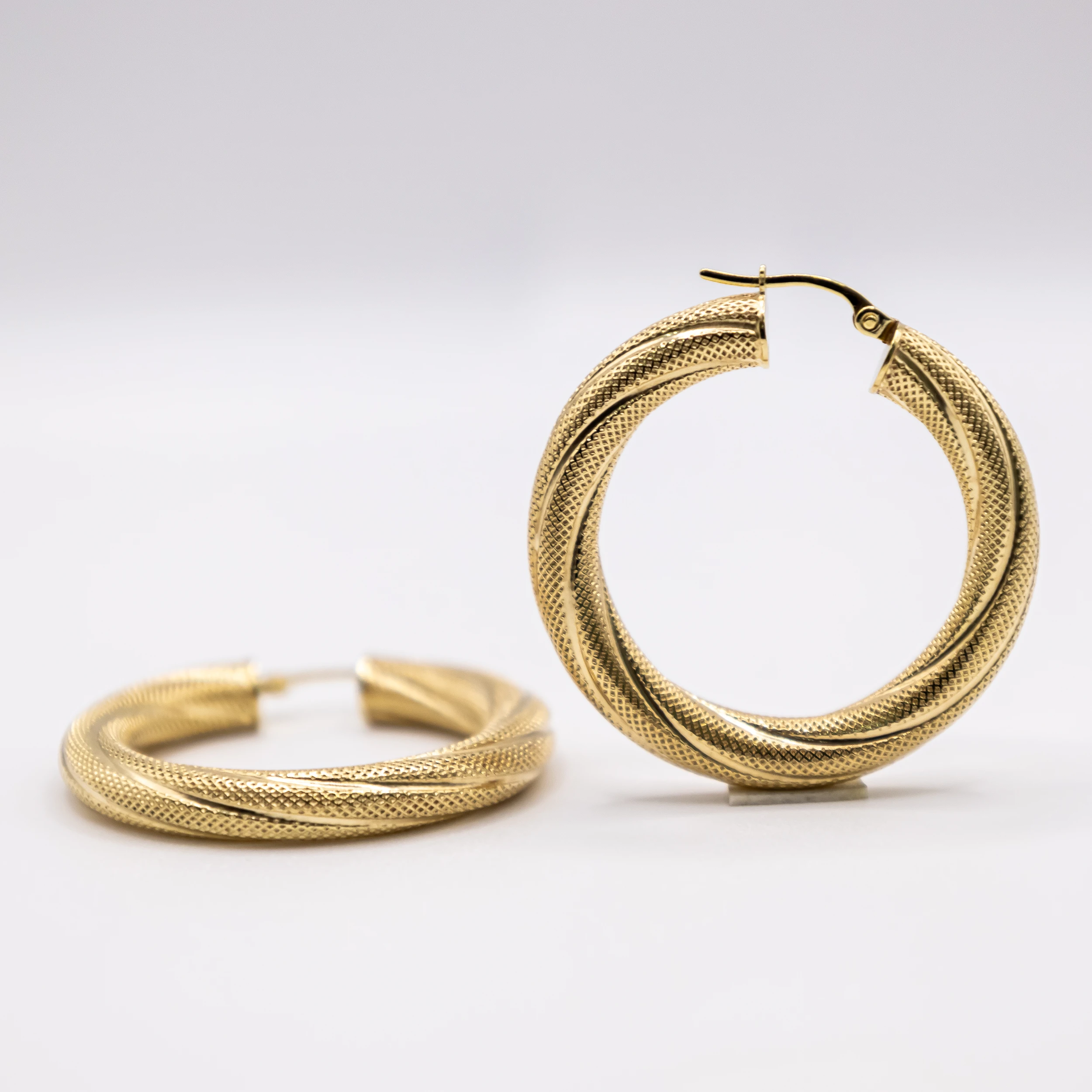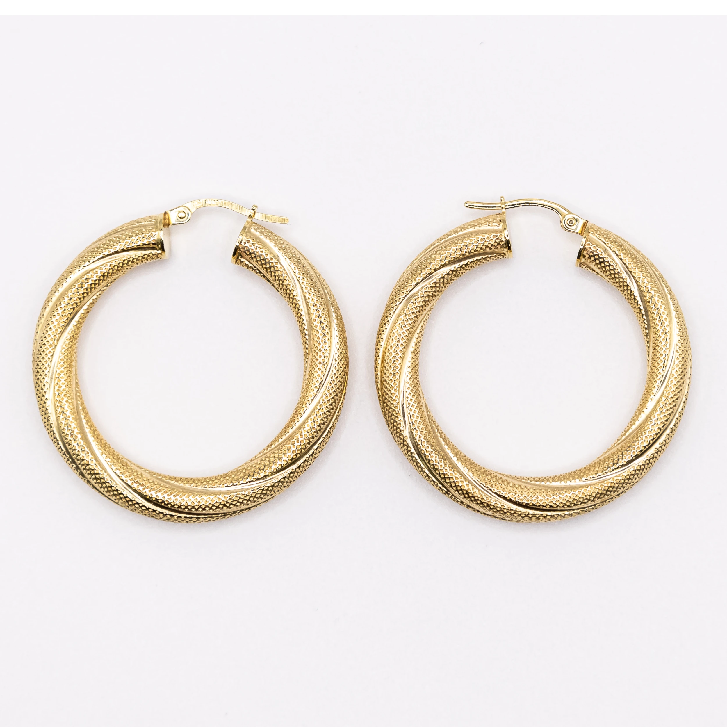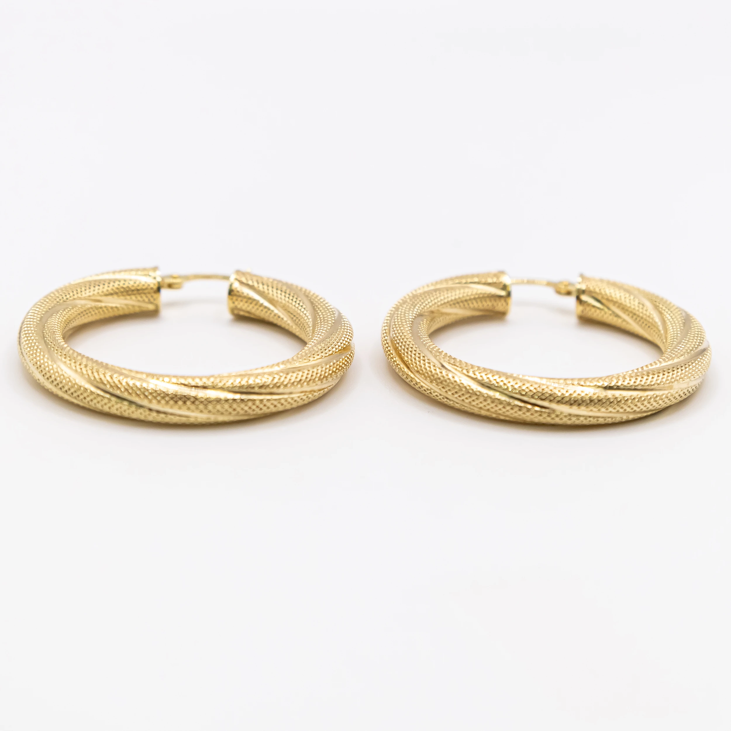 Argollas pequeñas de oro 10k con diseño de tubo decorado con un estilo trenzado.