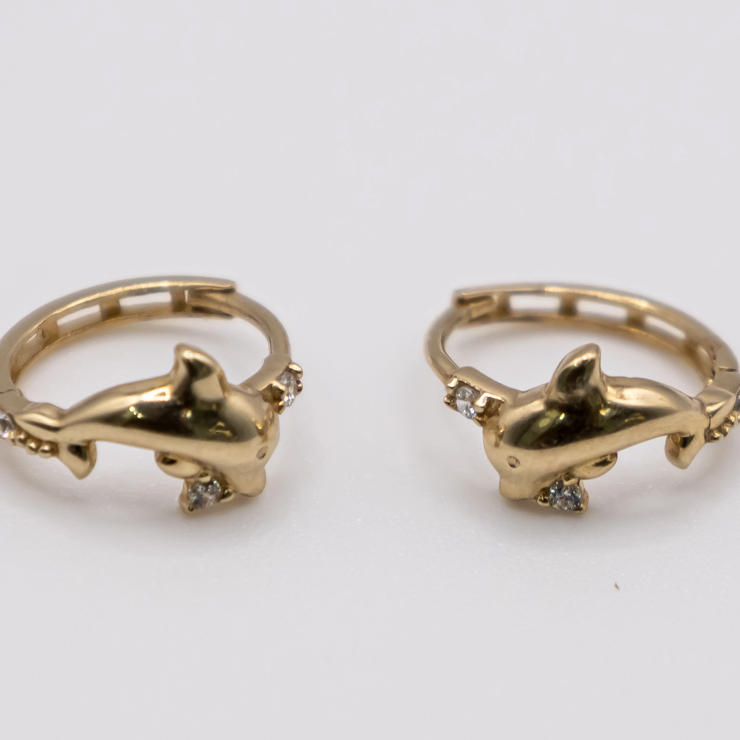 Argollas de oro 14k con zirconia y diseño de delfín.