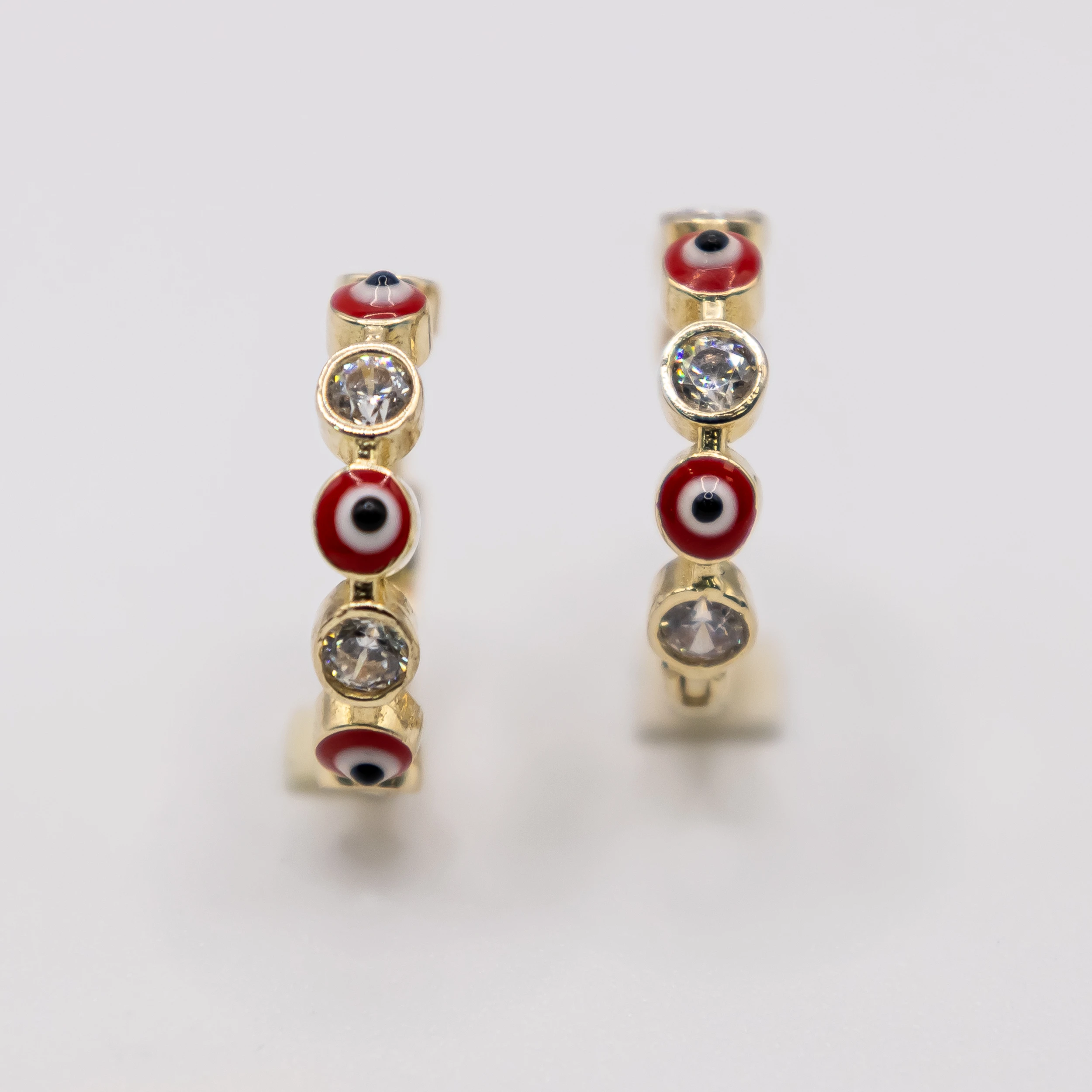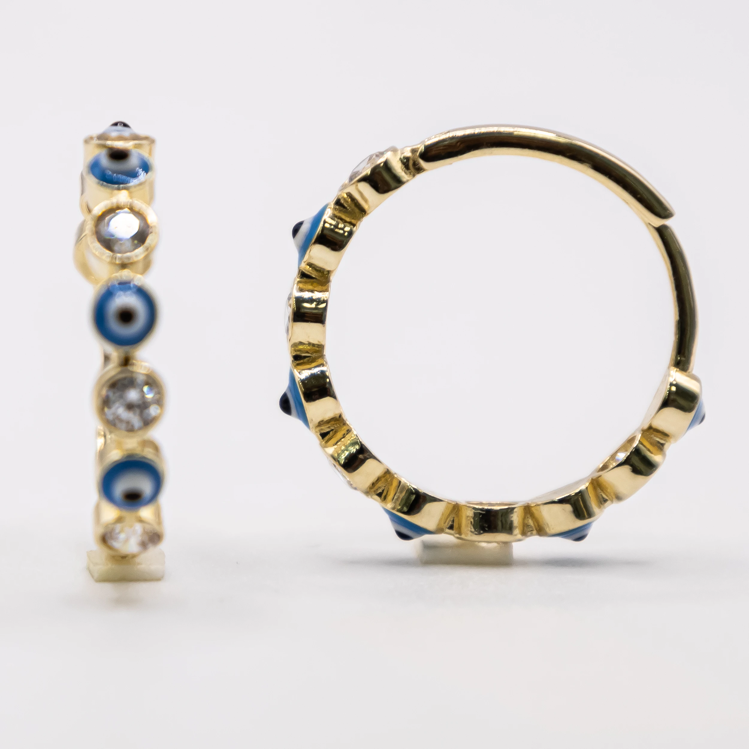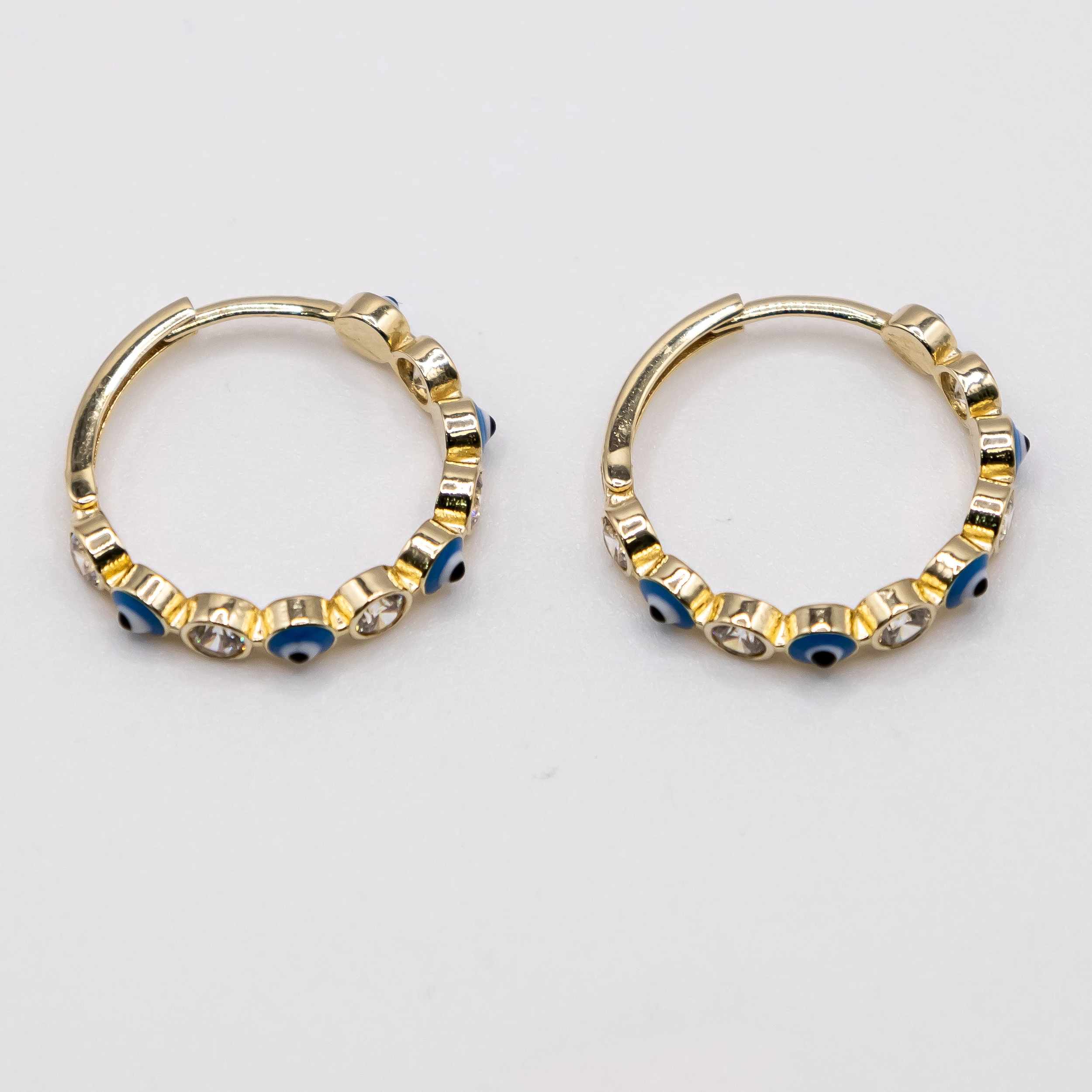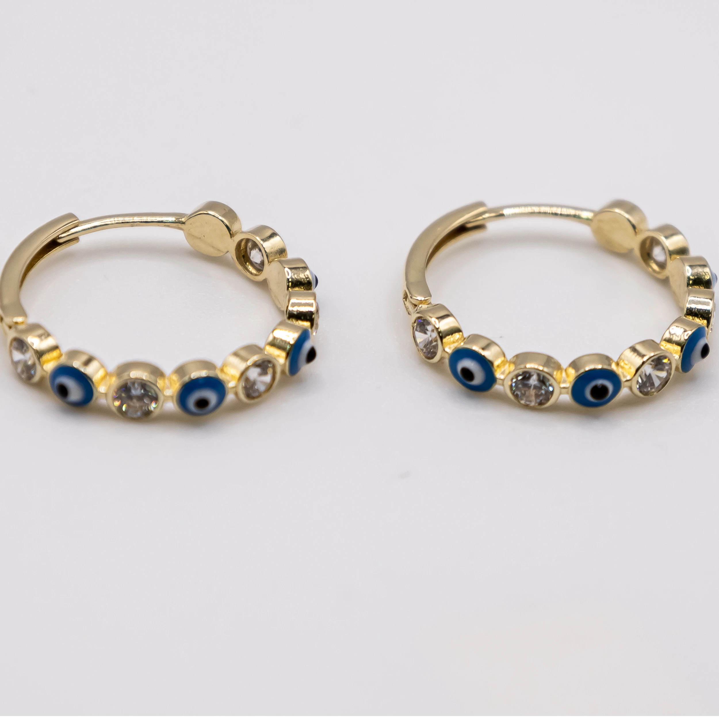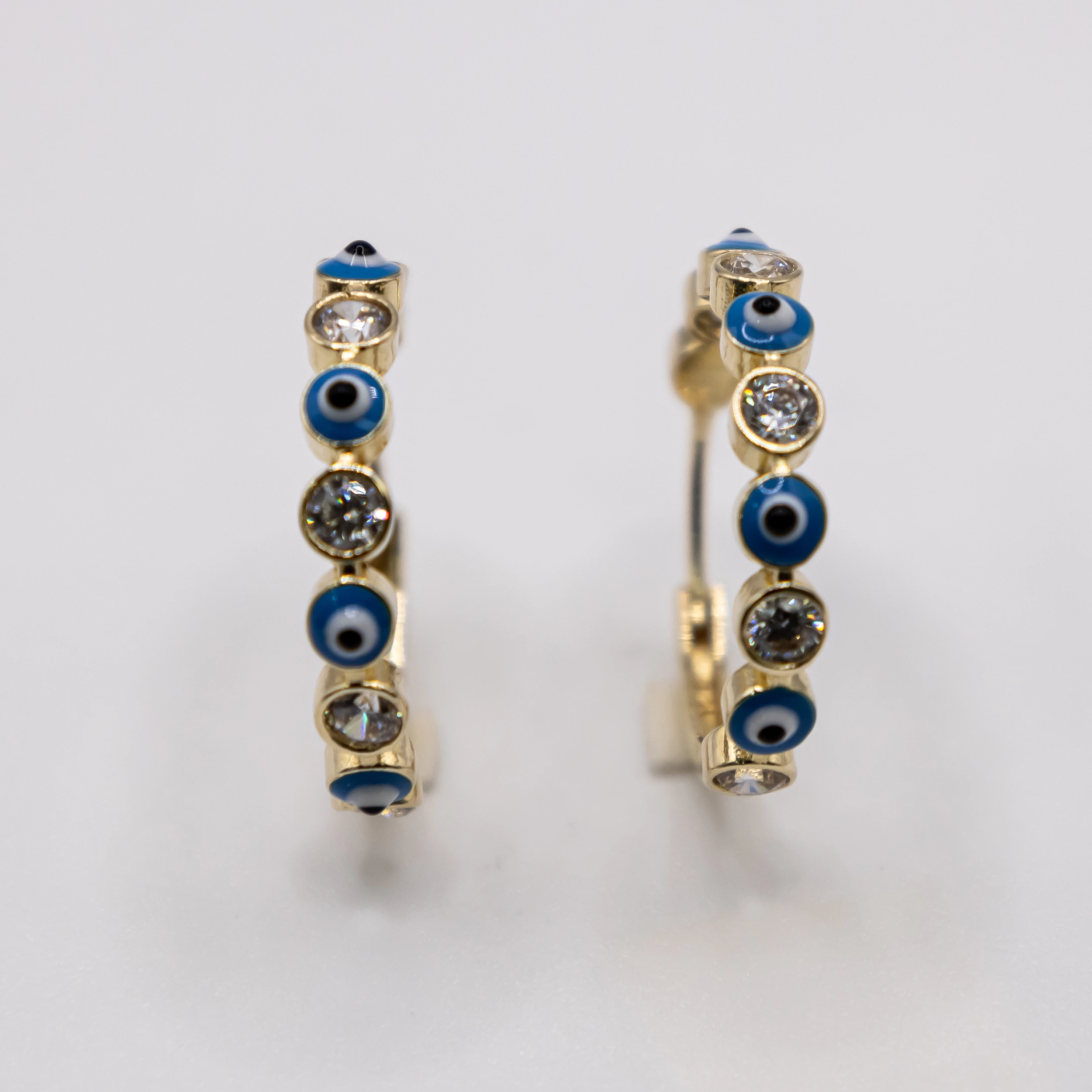 Argollas de oro 14k con ojitos de Santa Lucía Azules y zirconia.