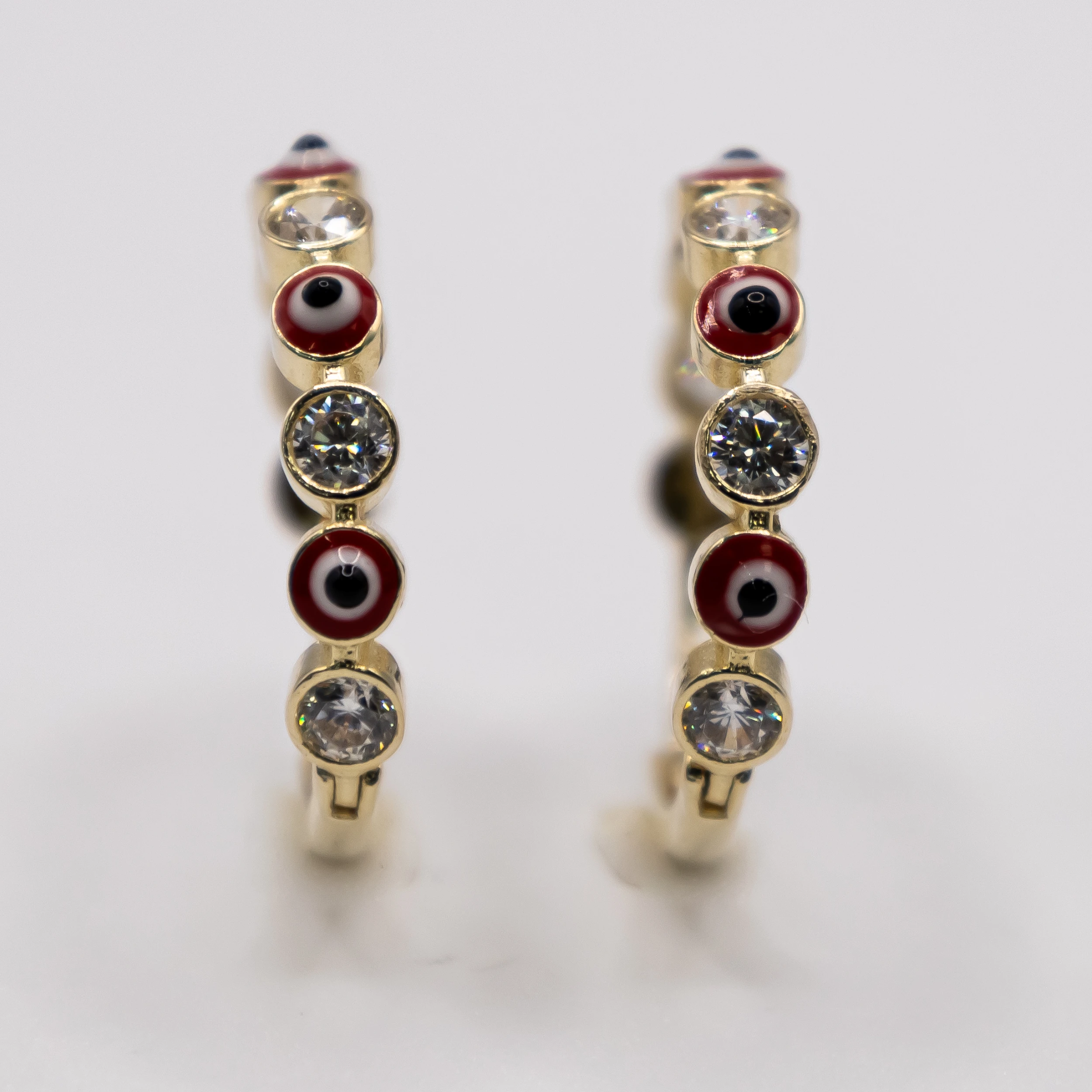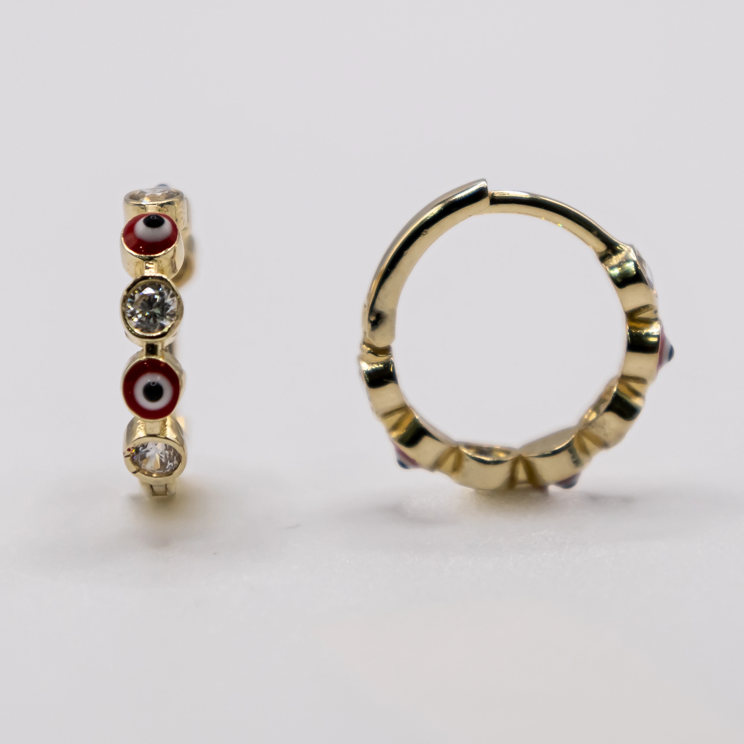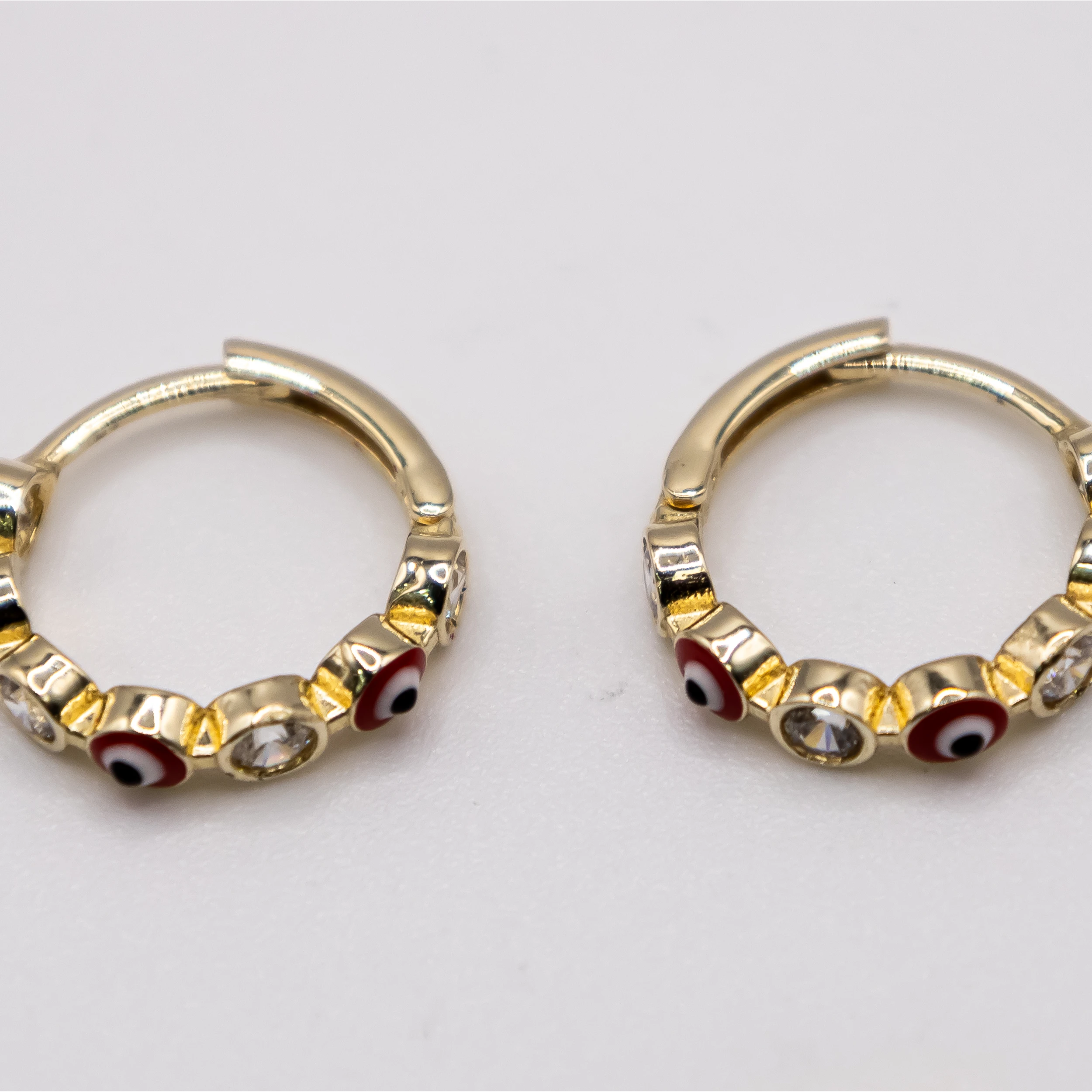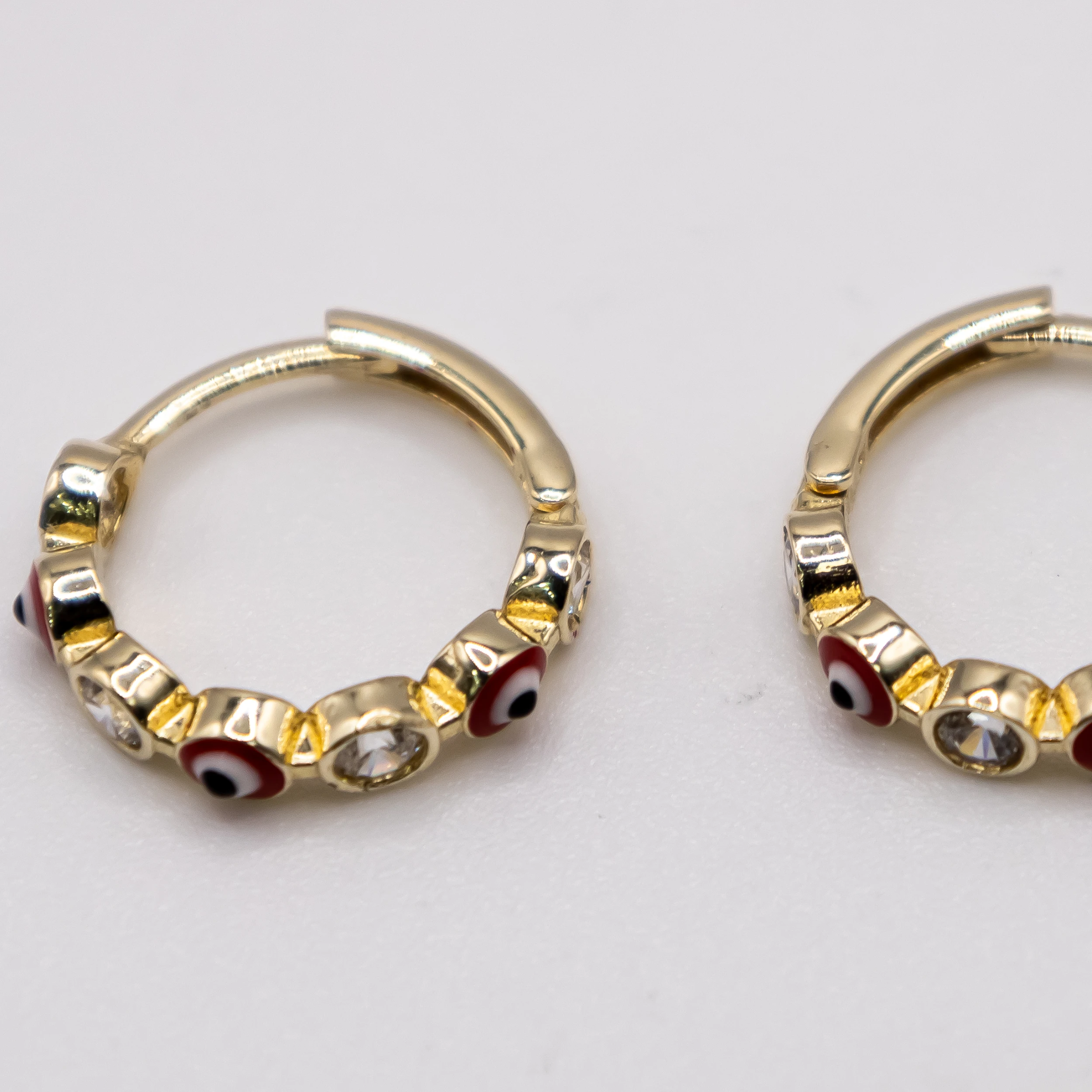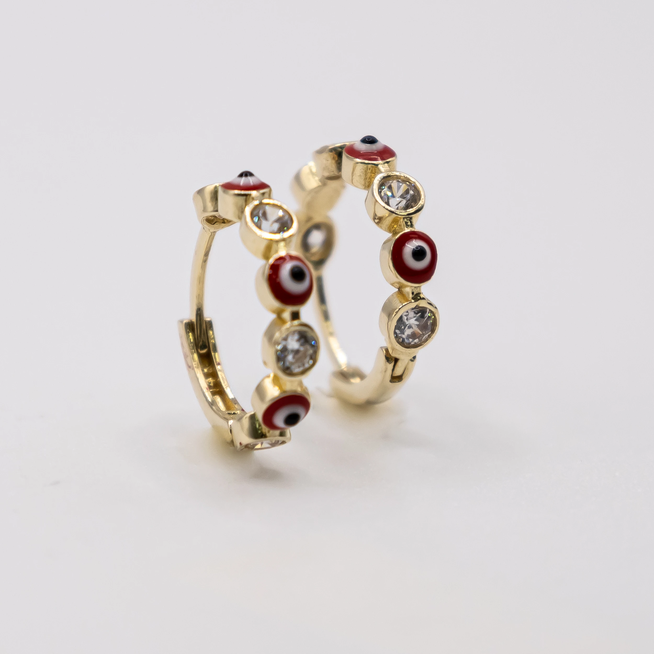 Argollas de oro 14k con ojitos de Santa Lucía rojos en zirconia y colores.