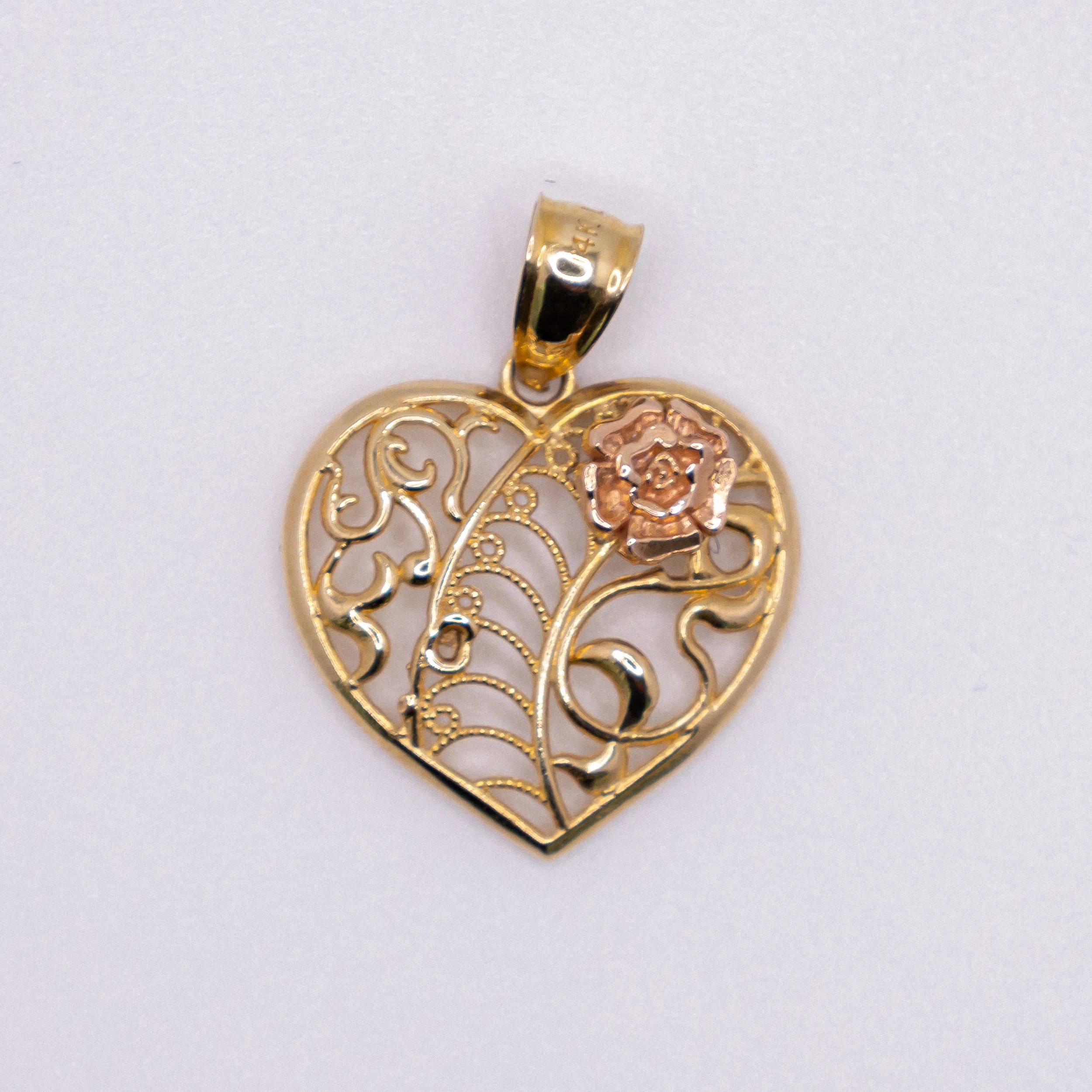 Dije de Corazon con Flor color rosa 14k