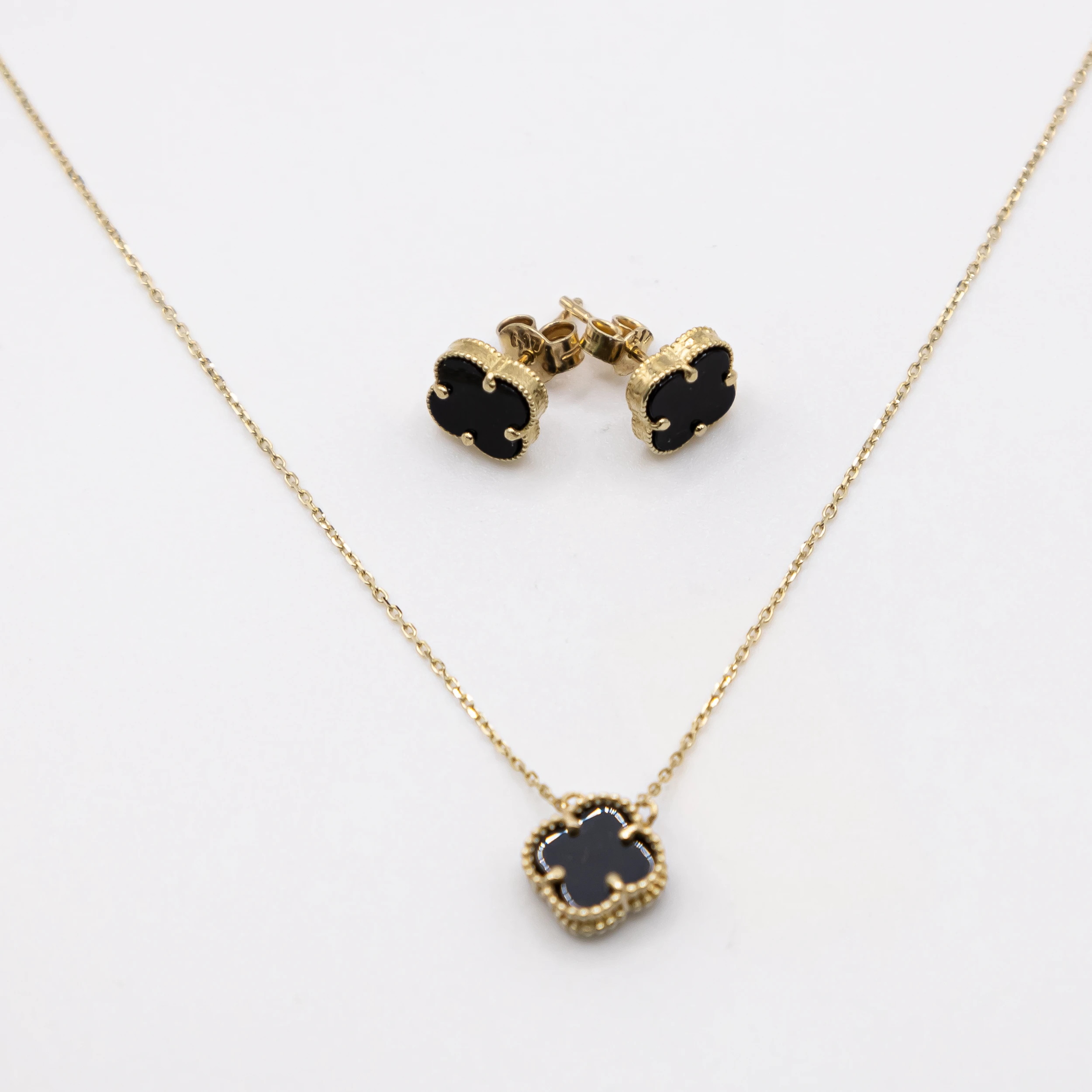 Conjunto Estilo Van Cleef Solitario de Color Negro 10k de aretes y cadena